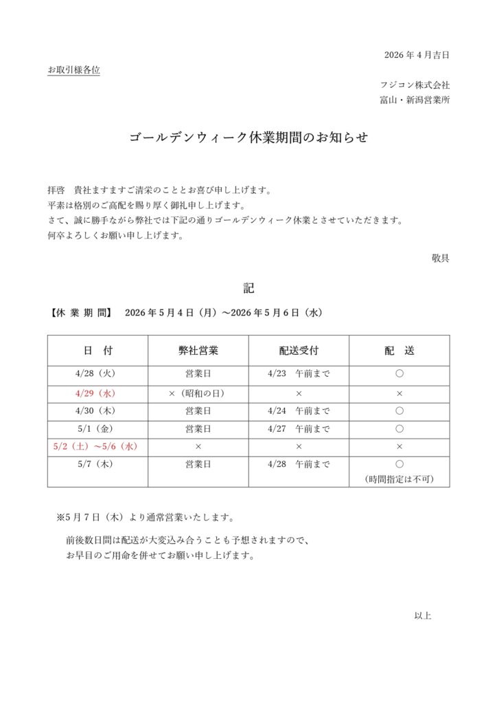 【富山・新潟営業所より】2026年 GW期間のご案内